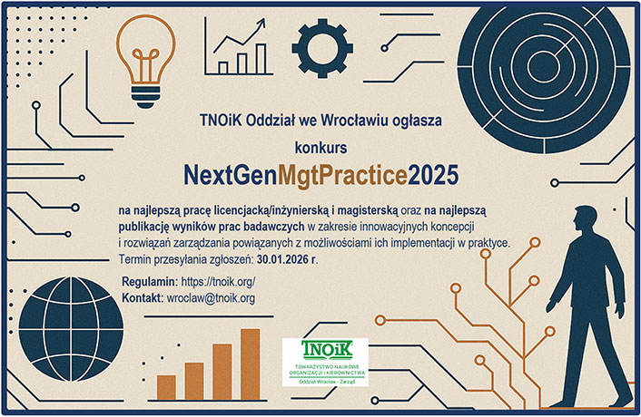 TNOiK Oddział we Wrocławiu ogłasza konkurs na najlepszą pracę licencjacką, inżynierską i magisterską oraz na najlepszą publikację wyników prac badawczych w zakresie innowacyjnych koncepcji i rozwiązań zarządzania powiązanych z możliwościami ich implementacji w praktyce organizacyjnej. Oddział Wrocławski Towarzystwa Naukowego Organizacji i Kierownictwa ogłasza konkurs NextGenMgtPractice 2025 w dwóch kategoriach: Kategoria I: na najlepszą pracę licencjacką, […]